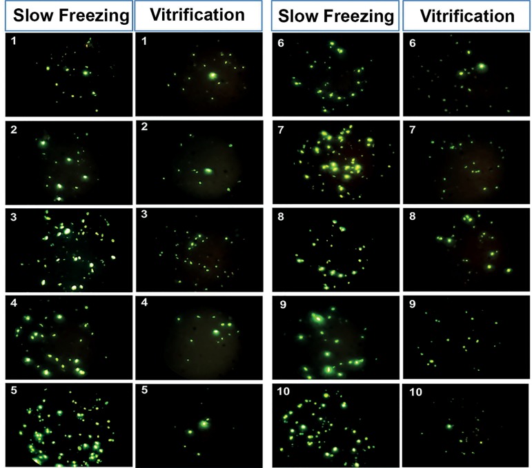 方法: 用蔗糖作为低温保护剂,超快速冷冻是一种与常规超快速冷冻方法不同的方法。实验1,用24个精液样本比较缓慢和超快速精子冷冻后精子恢复率。在实验2中,18个精液样本被用来比较在冷冻保存技术之后,解冻后精子DNA的分裂水平。